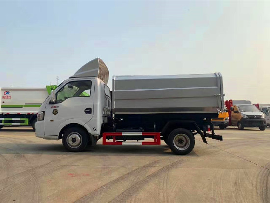 国六东风途逸挂桶垃圾车: 头式驾驶室,内饰配置高端,可选用2600/2800轴距,后双轮,柳州五菱112马力汽油发动机,5档变速箱,175R14LT轮胎,方向助理,原装空调,中控,遥控钥匙。 箱体容积4立方,双缸举升自卸,提升机可挂120/240L塑料桶,手动室外操作,自装自卸!