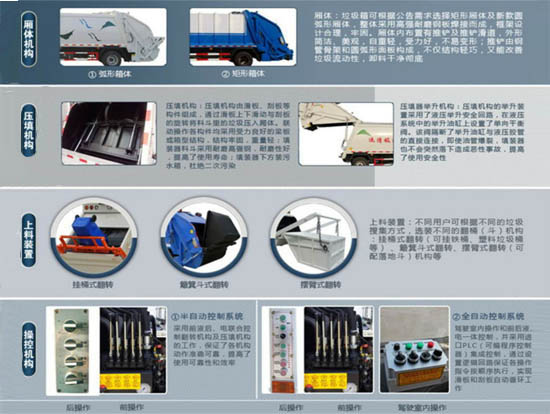 压缩式垃圾车是专门用于收集城镇居民生活垃圾和其他可压缩垃圾的的环卫专用车辆,压缩式垃圾车由密封式垃圾箱、液压系统、操作系统组成。整车为全密封型,自行压缩、自行倾倒、压缩过程中的污水全部进入污水箱,较为彻底的解决了垃圾运输过程中的二次污染的问题,关键元器件采用进口件,具有压力大、密封性好、操作方便、安全省力等优点。 主要有后装压缩式垃圾车和侧装压缩式垃圾车,其中后装压缩式垃圾车可选配后挂桶收集装置、铲斗收集装置、摆臂收集装置、挂铁桶收集装置,用户可以根据不同需要选择不同的收集装置。 后装压缩式垃圾车产品特点: 1、液压系统的**阀、油缸、连接管路等关键件,结构**,性能可靠,操作简单,维修方便。 2、**的电控系统 采用进口PLC(可编程序**器)集成**,机电液一体化**,自动化程度高。 3、推板**阀设有背压阀,在实现双向压缩垃圾的同时,推板能自动向箱体前方移动,从而调整了容纳垃圾的空间,装载效率高。 4、精美的流线型外观设计,上装部分采用专用高强度防腐钢板,提高了车辆使用寿命。 5、方便的操作** 作业**盒分别安装在驾驶室内和车尾,驾驶室内的作业**盒可**推挤卸料和选择操作模式(如自动或手动),车尾的作业**盒则**压填机构和翻桶机构的作业,使用操作十分方便。 6、发动机功率输出自动**即油门**可通过电气系统实现全自动**,满足垃圾压填循环和推挤卸料时对功率的要求,在其它工况下,发动机自动处于怠速状态,可减少功率损耗和故障发生率,降低耗油,提高使用经济性。 7、可选装后监视系统,方便于在驾驶室内实现可视装卸操作。 8、双保险系统,作业系统具有自动**和手动操纵双重功能,大大地保障和提高车辆的使用率。 9、特别设置的紧急制动按钮可使垃圾压填机构在任何状态或任何位置停止,保障作业人员、设备的安全。 10、有适用于方桶、圆桶的翻转机构及收集散装垃圾的铲斗装置,用户可根据不同的垃圾搜集方式,选装不同的收集机构。