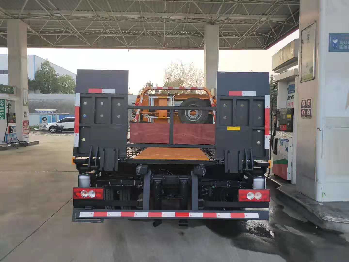 上装配置:平板采用3P2A冲压钢板,具有更加出众的平衡性,平板长4.2米,宽2.3米。背3吨,拖3吨。多路阀平衡阀采用意大利原装(海德)进口;液压缸佛山(海战力)采用德国技术,双层钢丝液压胶管,全进口密封圈。分体模压拼焊面板,耐磨、防滑抗阻力强。双侧联动操作系统,后工作灯2只,一个4吨液压绞盘(25米钢丝绳)一个洗手箱,2个小车,L型抱胎架1对,4根捆绑带,后隐藏液压伸缩式尾板,或尾部翻转(可定做中间加长0.5米),可伸出长度为1.1米,应对较长车型的SUV和越野车型。上装所有液压元件均采用进口部件,可选装国产件。