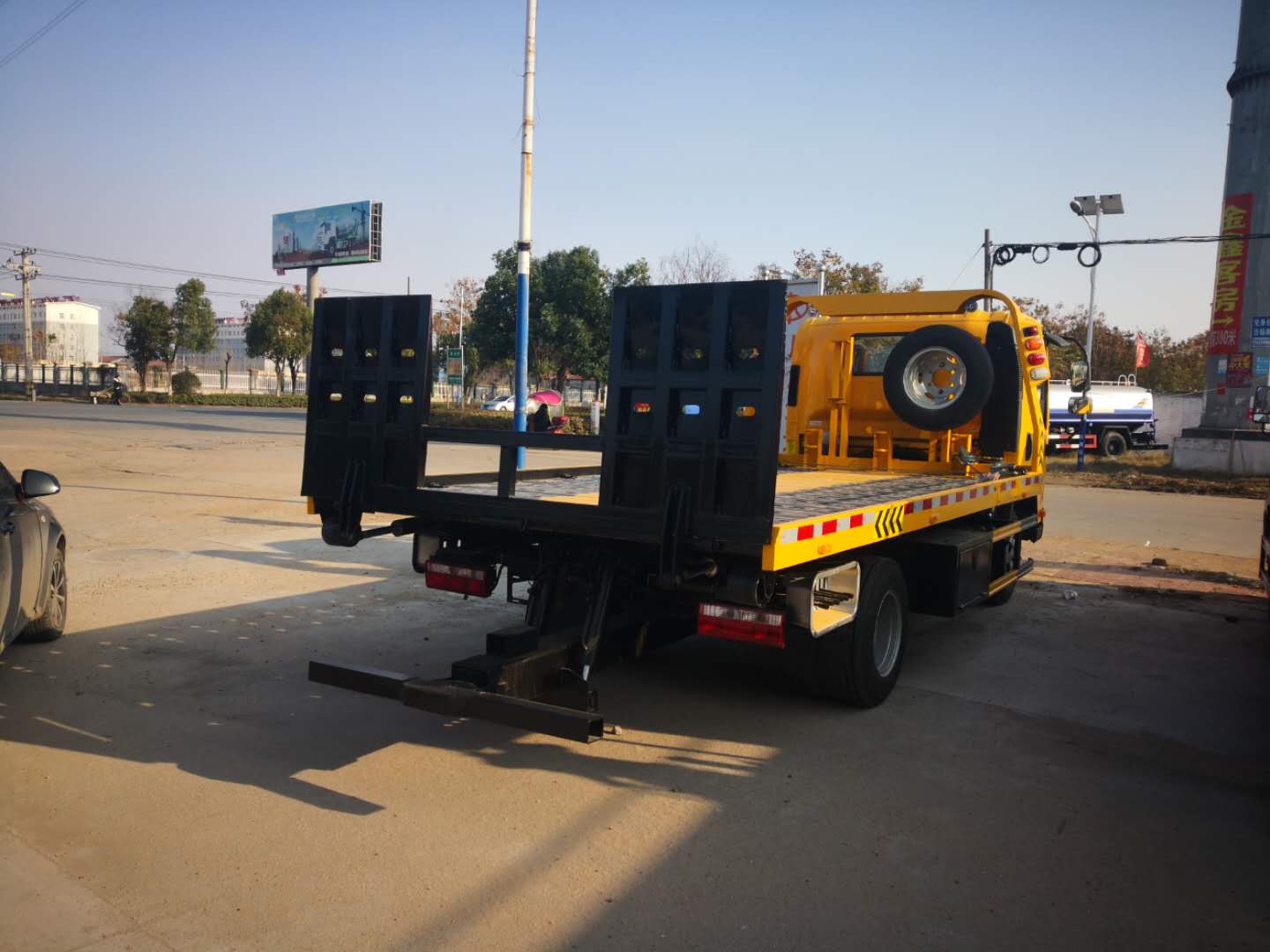 上装配置:采用德国技术折叠冲压式平板,平板长4.2米,宽2.3米,双侧联动操作装置,配后工作灯2只,一个4吨液压绞盘,带21米钢丝绳,一个工具箱,一个洗手箱,配2个小车,4根捆绑带,L型抱胎架一对,加液压伸缩式**板(1.1米),注:蓝牌一拖二清障分为尾部翻转和尾部伸缩两种,尾部翻转板可根据客户要求定做中间加长板(加长0.5米,整板长达到4.7米(不包含尾部翻转1米))